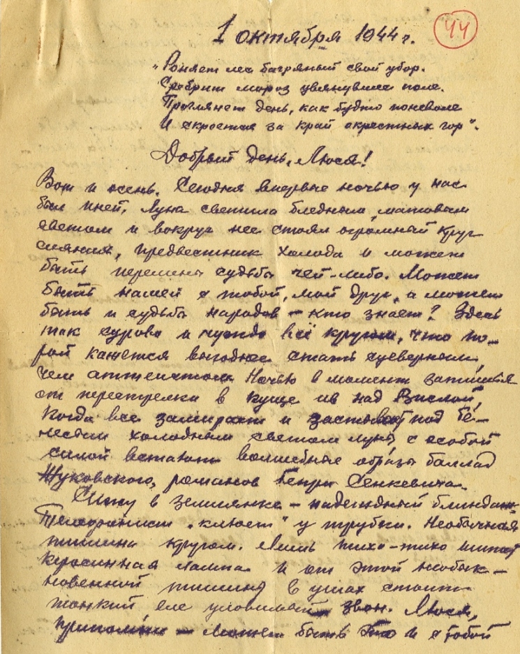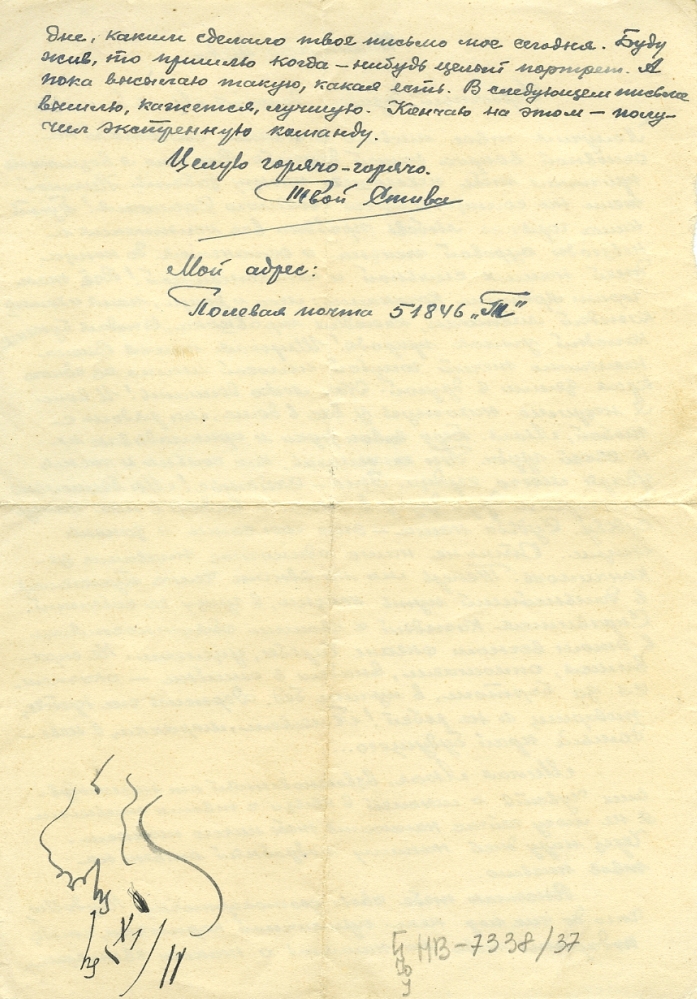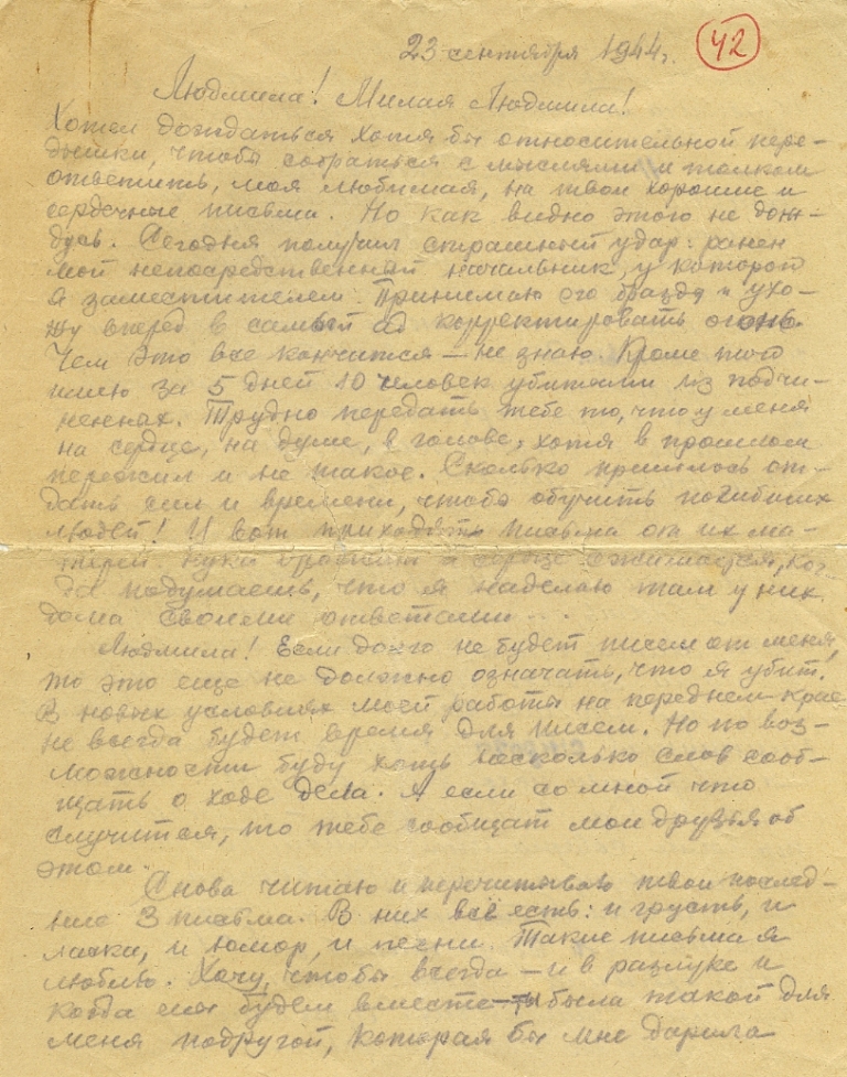 Людмила! Если долго не будет писем от меня, то это еще не должно означать, что я убит! В новых условиях моей работы на переднем крае не всегда будет время для писем. Но по возможности буду хоть несколько слов сообщать о ходе дела. А если со мной что случится, то тебе сообщат мои друзья об этом.