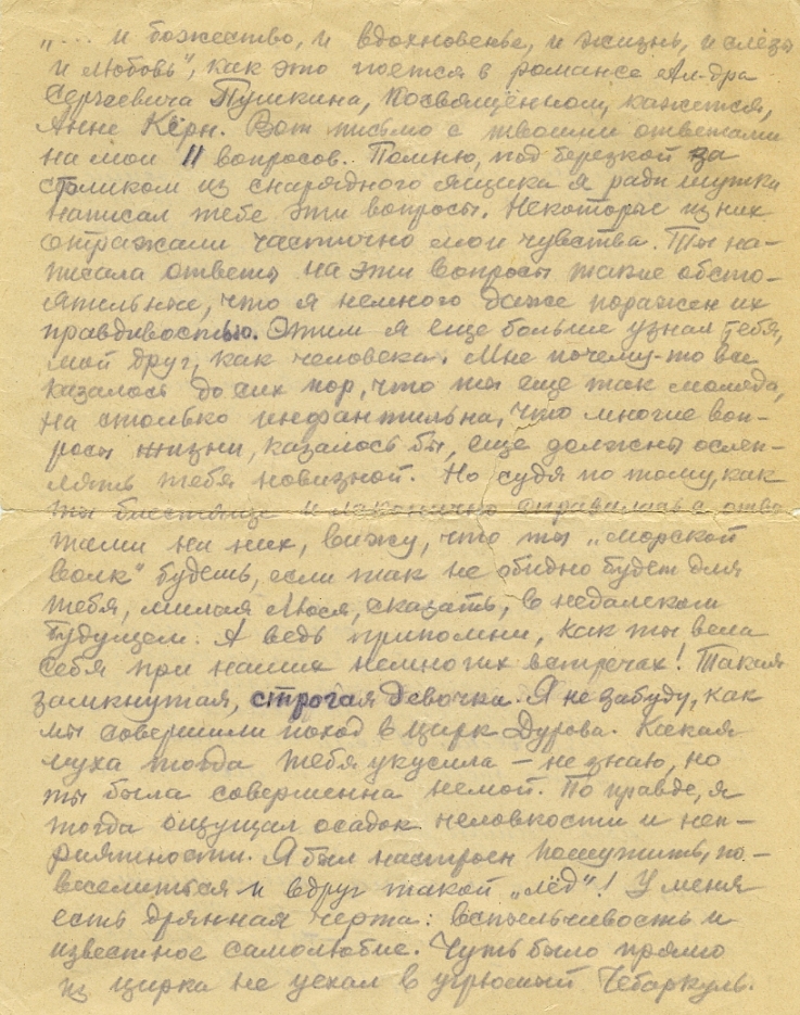 Снова читаю и перечитываю твои последние 3 письма. В них все есть: и грусть, и ласки, и юмор, и песни. Такие письма я люблю. Хочу, чтобы всегда – и в разлуке, и когда мы будем вместе – ты была такой для меня подругой, которая мне дарила «… и божество, и вдохновенье, и жизнь, и слёзы, и любовь», как это поётся в романсе А.С. Пушкина, посвященном, кажется, Анне Кёрн. Вот письмо с твоими ответами на мои 11 вопросов. Помню, под березкой за столиком из снарядного ящика я ради шутки написал тебе эти вопросы. Некоторые из них отражали частично мои чувства. Ты написала ответы на эти вопросы такие обстоятельные, что я немного даже поражен их правдивостью. Этим я еще больше узнал тебя, мой друг, как человека. Мне почему-то все ещё казалось до сих пор, что ты ещё так молода, настолько инфантильна, что многие вопросы жизни, казалось бы, еще должны ослеплять тебя новизной. Но судя по тому, как ты блестяще и лаконично справилась с ответами на них, вижу, что ты «морской волк» будешь, если так не обидно будет для тебя, милая Люся, сказать, в недалеком будущем. А ведь припомни, как ты вела себя при наших немногих встречах! Такая замкнутая, строгая девочка. Я не забуду, как мы совершили поход в цирк Дурова. Какая муха тогда тебя укусила – не знаю, но ты была совершенна немой. По правде, я тогда ощущал осадок неловкости и неприятности. Я был настроен пошутить, повеселиться и вдруг такой «лёд»! У меня есть дряная черта: вспыльчивость и известное самолюбие. Чуть было прямо из цирка не уехал в угрюмый Чебаркуль.