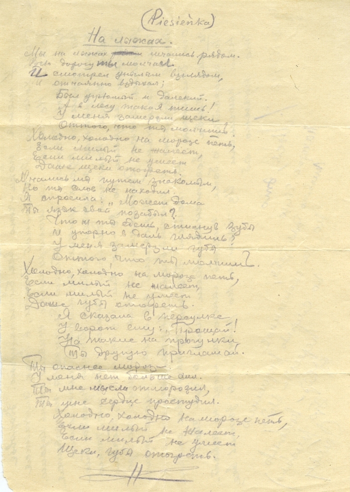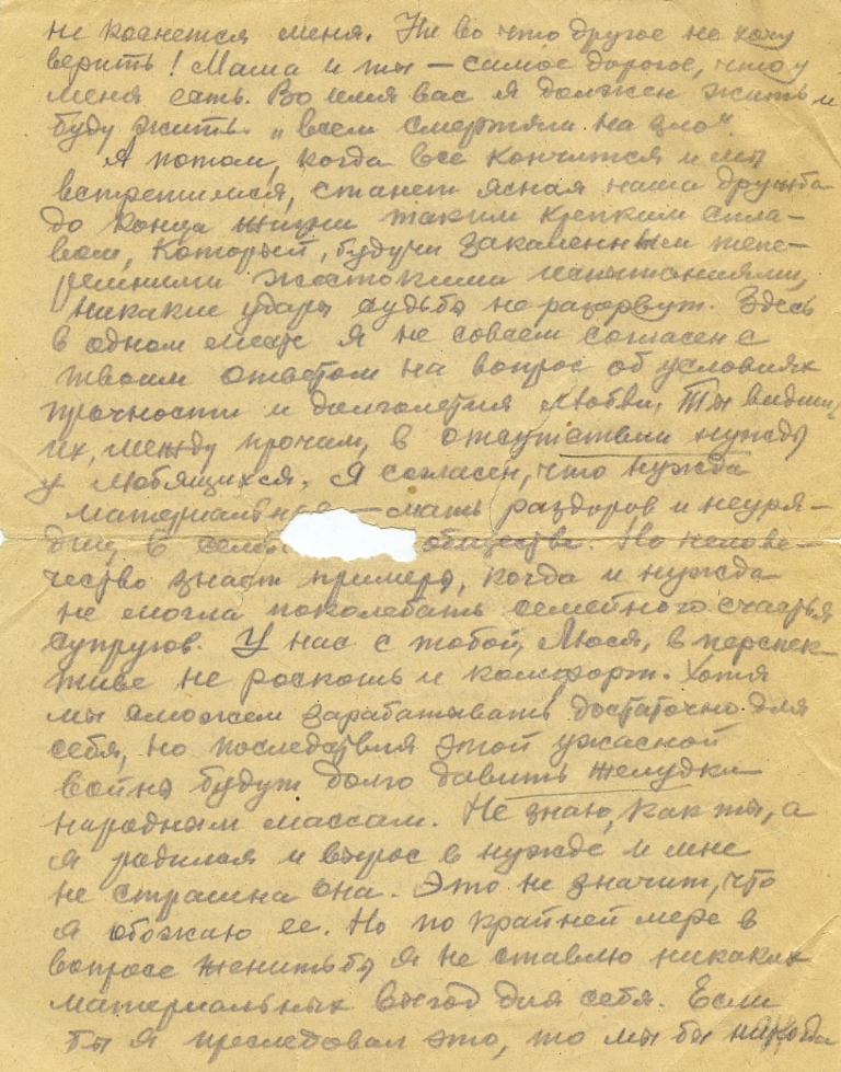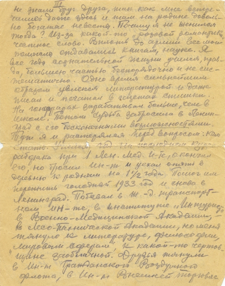 А потом, когда все кончится и мы встретимся, станет ясная наша дружба до конца жизни таким крепким сплавом, который, будучи закаленным теперешними жестокими испытаниями, никакие удары судьбы не разорвут. Здесь в одной мере я не совсем согласен с твоим ответом на вопрос об условиях прочности и долголетия любви. Ты видишь их, между прочим, в отсутствии нужды у любящихся. Я согласен, что нужда материальная – мать раздоров и неурядиц в семье и обществе. Не человечество знает примеры, когда и нужда не могла поколебать семейного счастья супругов. У нас с тобой, Люся, в перспективе не роскошь и комфорт. Хотя мы сможем вырабатывать достаточно для себя, но последствия этой ужасной войны будут долго давить желудки народным массам. Не знаю, как ты, а я родился и вырос в нужде и мне не страшна она. Это не значит, что я обожаю её. Но по крайней мере в вопросе женитьбы, я не ставлю никаких материальных выгод для себя. Если бы я преследовал это, то мы бы никогда не знали друг друга, так как мне встречались даже здесь и там на родине довольно богатые невесты. Почему я не женился тогда? Из-за какой-то «розовой романтики» честное слово. Вплоть до армии все мои помыслы отдавались книгам, науке. Я все года сознательной жизни учился, правда, большею частью беспорядочно и не систематично. Одно время сильнейшим образом увлекся литературой и даже писал и печатал в газетах стишки. На гонорарах зарабатывал больше, чем в школе. Потом судьба забросила в Ленинград с его бесконечными возможностями. Тут я и растерялся перед вопросом: кем стать. Учился год на последнем курсе рабфака при Лен. Мед. институте, окончил его, но бросил институт и уехать опять в деревню к родным на 1,5 года. Помог им пережить голодный 1933 год и снова в Ленинград. Побывал в ж-д транспортном институте «Интурист», в Военно-Медицинской Академии, в Лесо-Технической Академии, но меня тянуло к литературе, философии, «мировым сферам», и какой-то чертовщине заоблачной. Друзья тянули в Ин-т Гражданского Воздушного флота, в Ин-т Внешней Торговли.
