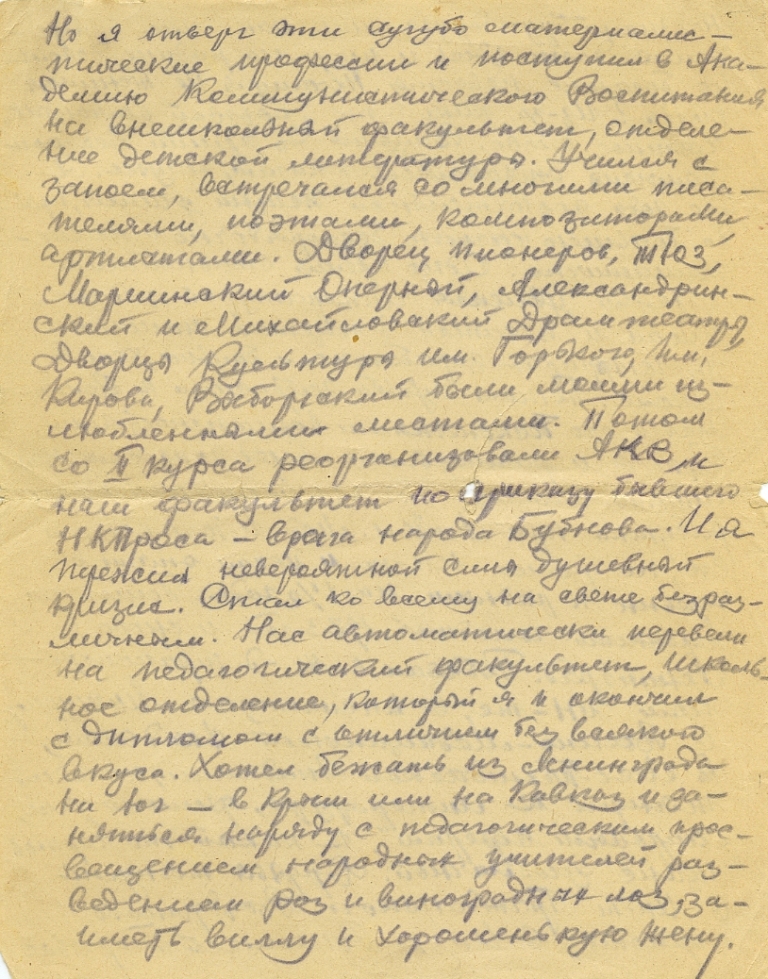 Но я отверг эти сугубо материалистические профессии и поступил в Академию Коммунистического Воспитания на внешкольный факультет, отделение детской литературы. Учился я запоем, встречался со многими писателями, поэтами, композиторами, артистами. Дворец Пионеров, ТЮЗ, Мариинский Оперные, Александрийский и Михайловский Драмтеатры, Дворцы культуры им.Горького, им. Кирова, Выборгский были моими излюбленными местами. Потом со 2 курса реорганизовали АКВ и наш факультет по приказу бывшего НКпроса-врага народа Бубнова. И я пережил невероятной силы душевный кризис. Стал ко всему на свете безразличным. Нас автоматически перевели на педагогический факультет, школьное отделение, который я и окончил с дипломом с отличием без всякого вкуса. Хотел бежать из Ленинграда на юг – в Крым или на Кавказ и заняться наряду с педагогическим просвещением народных учителей разведением роз и виноградных лоз, заиметь виллу и хорошенькую жену.