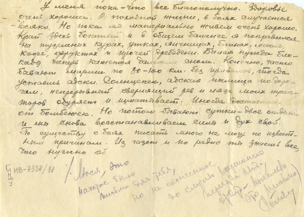 У меня покачто все благополучно. Здоровье очень хорошее. В походной жизни, в боях случается всякое. Но пока мы материально живем очень хорошо. Край здесь богатый и в общем балансе я поправился на туземных курах, утках, яичницах, блинах, масле, кофе, фруктах и прочей дребедени. Былая нужда блокады теперь кажется далеким сном. Конечно, часто бывают марши по 80-100 км без привалов, тогда устаешь адски. Солнцепек, адская пылища по дорогам, непрерывный сверлящий рев и лязг моих тракторов одуряет и изматывает. Иногда достается от бомбежек. Но потом бывают сутки-двое отдыха и мы снова восстанавливаем силы и дух свой. По существу о боях писать много не могу по известным причинам. Из газет и по радио ты знаешь все, что нужно об этом.