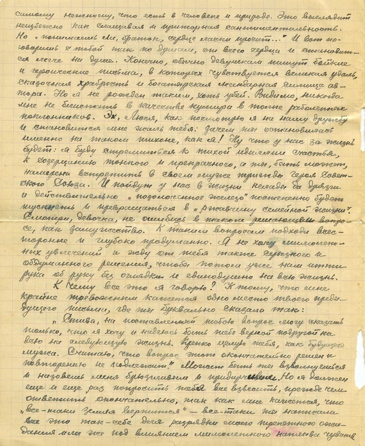 Но об этом хватит. Людмила, тебе возможно скучно читать такие письма, как начало вот этого письма. Хочется, чтобы и об этом высказалась и обо всем, что плохо и нехорошо с моей стороны. Будучи небойким человеком, я не владею и бойким стилем ни в жизни, ни в делах, ни в письмах, как видишь. У меня такой дурной характер, что я всегда страдаю крайней чувствительностью к самому тонкому, самому нежному, что есть в человеке и природе. Это выглядит неизбежно как слащавая и приторная сентиментальность. Но «понимаешь ли, браток, сердце ласки просит…». И вот поговоришь с тобой так по душам, от всего сердца и становится легче на душе. Конечно, обычно девушкам пишут бойкие и героические письма, в которых чувствуется великая удаль, сказочная храбрость и богатырская легендарная силища автора. Но я не рожден таким, хоть убей. Видимо, никогда мне не блистать в качестве кумира в толпе раболепных поклонников. Эх, Люся, как посмотрю я на нашу дружбу и становится мне жаль тебя: зачем ты остановилась именно на таком тихоне, как я! Ну что у нас за жизнь будет: я буду стремиться к тихой идиллии счастья, к созерцанию тонкого и прекрасного, а ты, быть может, намерена встретить в своём муже трижды героя Советского Союза. И пойдут у нас в жизни нелады да дрязги и действительно «позолоченное железо» постепенно будет тускнеть и превращаться в «ржавчину семейной жизни». Смотри, девочка, не ошибись в таком решающем вопросе, как замужество. К таким вопросам подходи всесторонне и глубоко продуманно. Я не хочу мимолетных увлечений и жду от тебя также серьезного и обдуманного решения, чтобы потом уже нам идти рука об руку без оглядки и единодушно на всю жизнь.