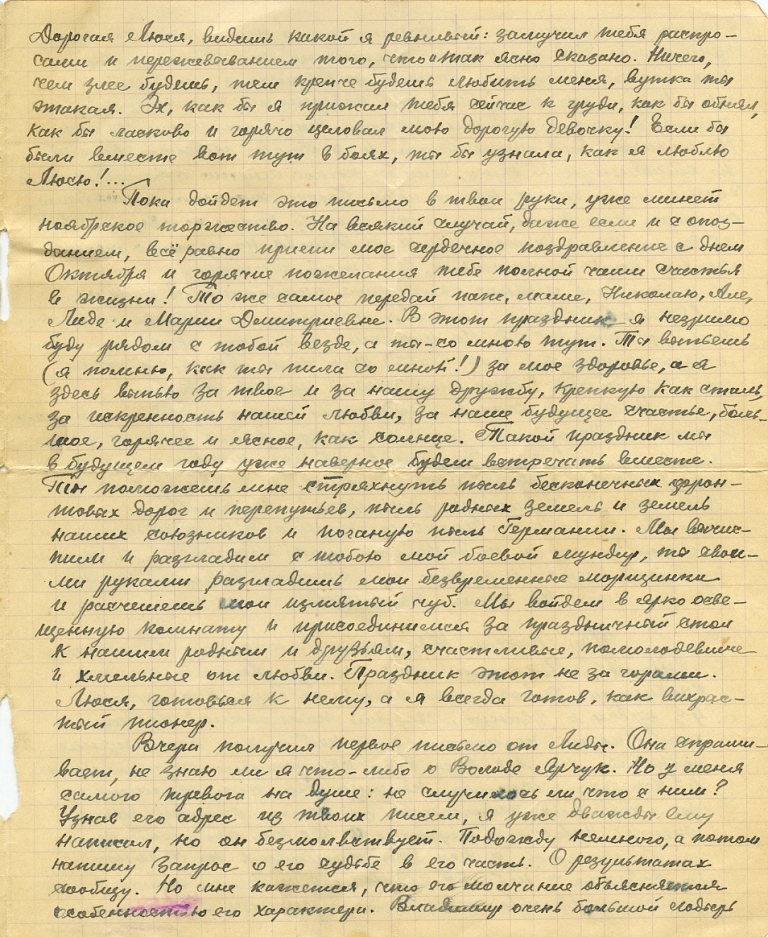 Пока дойдет это письмо в твои руки, уже минет ноябрьское торжество. На всякий случай, даже если и с опозданием, всё равно примешь моё сердечное поздравление с днём Октября и горячие пожелания тебе полной чаши счастья в жизни! То же самое передай папе, маме, Николаю, Але, Лиде и Марии Дмитриевне. В этот праздник я незримо буду рядом с тобой везде, а ты – со мною тут. Ты выпьешь (я помню, как ты пила со мной!) за моё здоровье, а я здесь выпью за твоё и за нашу дружбу, крепкую как сталь, за искренность нашей любви, за наше будущее счастье, большое, горячее и ясное, как солнце. Такой праздник мы в будущем году уже наверное будем встречать вместе. Ты поможешь мне стряхнуть пыль бесконечных фронтовых дорог и перепутьев, пыль родных земель и земель наших союзников и поганую пыль Германии. Мы вычистим и разгладим с тобою мой боевой мундир, ты своими руками разгладишь мои безвременные морщинки и расчешешь мой измятый чуб. Мы войдем в ярко освещенную комнату и присоединимся за праздничный стол к нашим родным и друзьям, счастливые, помолодевшие и хмельные от любви. Праздник этот не за горами. Люся, готовься к нему, а я всегда готов, как вихрастый пионер.