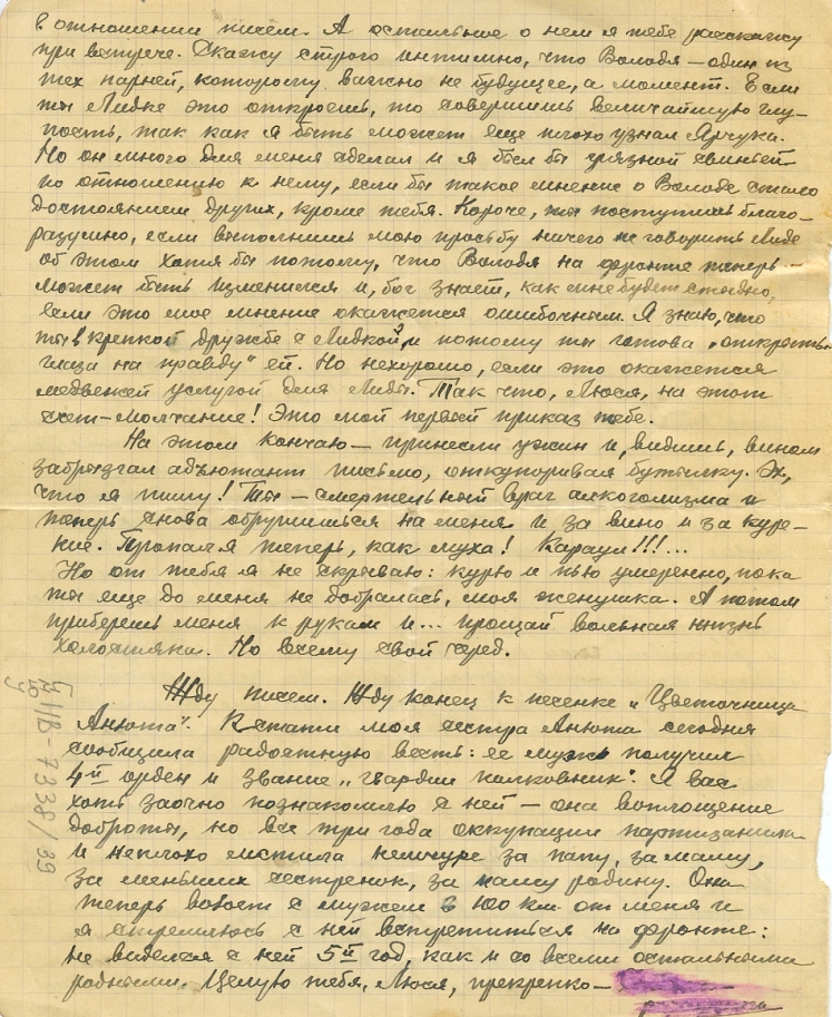 Жду писем. Жду конец к песенке «Цветочница Анюта». Кстати, моя сестра Анюта сегодня сообщила радостную весть: ее муж получил 4й орден и звание «Гвардии Полковник». Я вас хоть заочно познакомлю с ней – она воплощение доброты, но все три года оккупации партизанила и неплохо мстила немчуре за папу, за маму, за меньших сестренок, за нашу родину. Она теперь воюет с мужем в 100 км от меня и я стремлюсь с ней встретиться на фронте: не виделся с ней 5-й год, как и со всеми остальными родными. Целую тебя, Люся, прекрепко – Стива.
