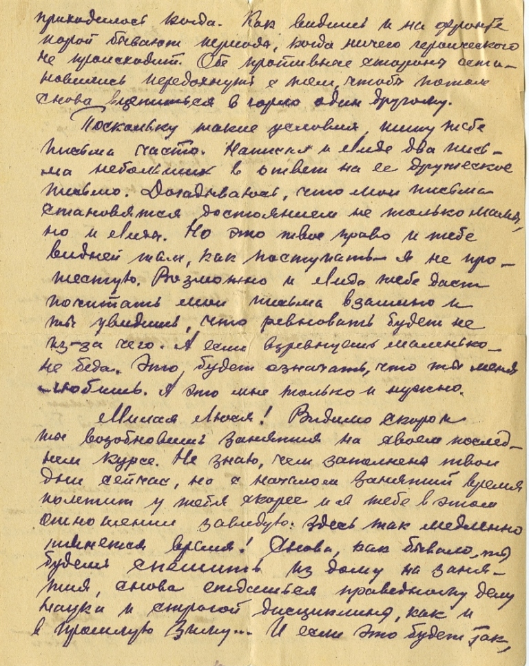 Поскольку такие условия, пишу тебе письма часто. Написал и Лиде два письма небольших в ответ на её дружеское письмо. Догадываюсь, что мои письма становятся достоянием не только мамы, но и Лиды. Но это твоё право и тебе видней там, как поступать – я не протестую. Возможно и Лида тебе даст почитать мои письма взаимно и ты увидишь, что ревновать будет не из-за чего. А если взревнуешь маленько – не беда. Это будет означать, что ты меня любишь. А это мне только и нужно.