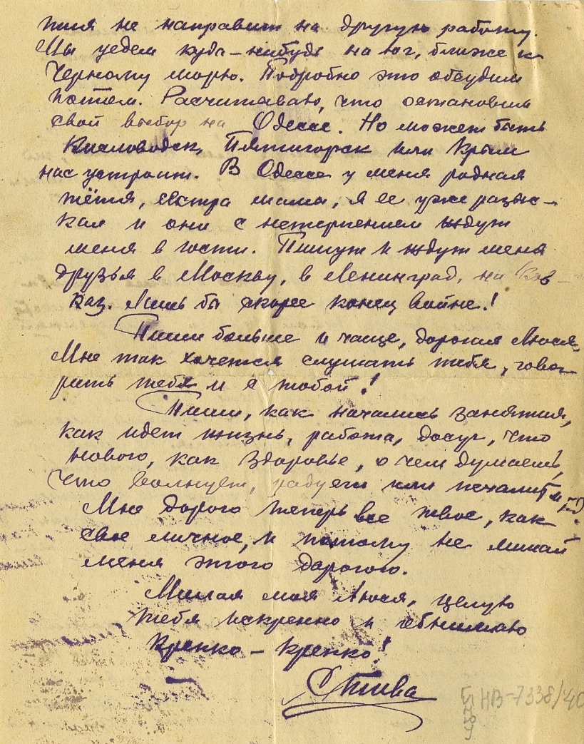 Пока! Целую горячо и желаю здоровья от всей души! Привет маме, папе, Николаю, Лиде и М.Д.