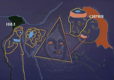У Сатурна Солнечной Системы в облачной атмосфере вырисовывается морда быка с ноздрями и многоугольником над головой. Сирия очень часто упоминается в надписях камней и рельефа Земли. Почему? Ответ найдёте в Велесовой Книге: «Принеся в жертву белых коней, ушли мы из Семиречья с гор Ирийских из Загорья и шли век (!). И так как пришли в Двуречье, мы разбили там всех своей конницей, и пошли в землю Сирии. И там остановились, а после шли горами великими, и снегами, и притекли в степи со своими стадами. И там скифами перво-наперво были наречены наши пращуры». Весь мир и Сирия, в том числе, была в древние времена заселена славянами, детьми Ариев. На рельефе Сирия подписана в треугольнике из звёзд как «Асира» (Асирия). В руке сатир держит «Ара Ра», а это Полярная звезда. Круг с крестом, выбитые тут же, означает Землю. Ещё раз подтверждается, что Земля – отжим от звезды Поларис, то есть, её каменный кусок, большой метеорит, присланный в Солнечную Систему и поставленный под её ось. Здесь же выбито слово «таран». Наверху, над головой сатира написано «Диа» – имя будущей Земли, и нарисован зигзаг от морды собаки, выбитой тут же (Сириус) к Полярной звезде, что ещё раз говорит о замене Сириуса Полярной звездой на небосводе Земли в результате тарана (столкновения) звёзд. В результате Дия встала на орбиту земного Солнца. Великий Иерарх Земли, как гигант Атлас, держит Землю на своих плечах, он запечатлён на рельефе Европы и России: