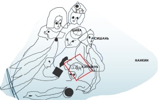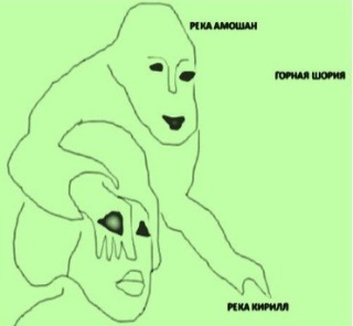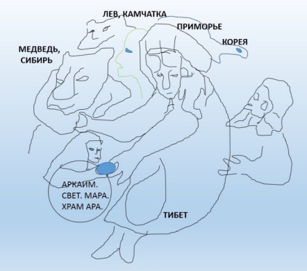 Если смотреть на Азию глобально, то увидите Шиву, окружённым людьми, львом (Камчатка), медведем (Сибирь), с сидящей черепахой у него на голове (Приморье и Корея) и дэвом (стихийный дух) на плече: