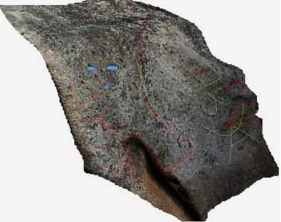 С уменьшением яркости фотографии и увеличением её контрастности, проступает текст: «Зара (свет) Такла. Сатирн (Сатурн). Сатира таран. Титана шар. Асиа (Азия) Тартари (Тартария)». Говорится о свете пустыни Такла-Макал в центре Азии, сгоревшей от удара с Сатурном. Землю удержал на месте Титан, держащий её на спине. Портрет сатира, козлоного существа, вы видите на мегалите. Знаком Сатурна являлась морда быка, а она присутствует в большом количестве на рельефе Земли. Например, на рельефе, у головы спящей девушки в районе Сирии: