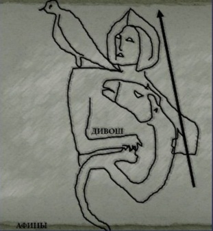 На рельефе выбиты три птицы, две человеческих головы (одна – перевёрнутая, принадлежит Митре, и ещё две слиты, как близнецы), присутствует знак Кассиопеи, там уточка есть: