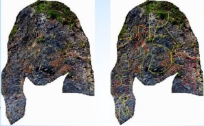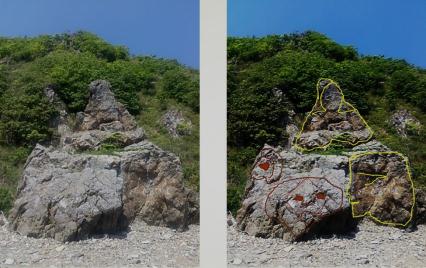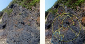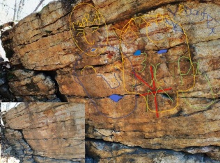 На этой каменной стене просматриваются лица и буквы (и я ещё не все обвела):