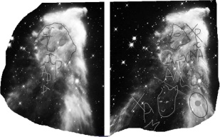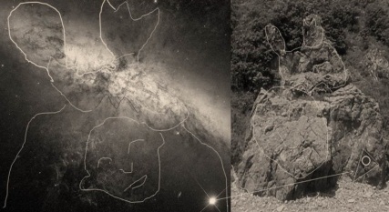 Голова женщины заключена в пирамиду, в руках у неё чаша и книга, а ниже – мужской профиль и женская голова. На рельефе тоже идёт надпись «Мати ара». Снова всё совпало. Теперь попробуем сравнить туманность Большой Медведицы (фотография NASA в свободном доступе) со скальным изваянием: