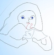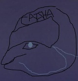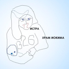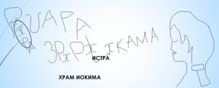 Ото лба по носу и усам идёт голубыми буквами надпись «Иси дом», а Иса – это одно из имён Иисуса. Под усами Исы виднеется мордочка с острыми ушами, похожая на кота.