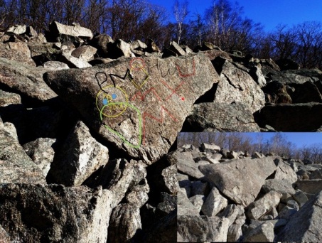 В ущелье Дарданеллы Приморского края есть валуны от разрушенного храма с изображениями и буквами (в нижнем углу фото чистого камня, без обводки):