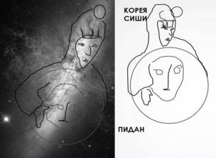 Видим тусклую звезду Мегрец, где обитает Атри. Ещё обнаружила ромб с SOS и числом 3107, рядом обвела морду медведя. Между ромбом и ковшом видна руна силы, бьющая концом в глаз медведя, и слова «Мир бира (медведя)», «Ас Ариани». На левой части обведена летящая женщина со словами «Дом Сиша, храм» на кокошнике. И снова знакомый Сиша. Посмотрим на рельеф Земли в районе Сиши Корейского полуострова и увидим полное совпадение рисунков в созвездии и на рельефе: