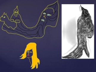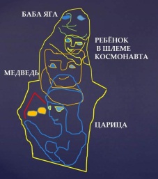 Слева – бредущий по воде конь с восседающим воином, справа – изображение огромной головы витязя в шлеме. Воин тащит за бороду колдуна, изображение которого находится в бороде витязя. В этом же месте нарисован Черномор, с длинной бородой и с царевной на руках. У царевны по спине свисает длинная коса. В бороде витязя скрыт портрет девушки – царевны. Как видите, текст сказки подтвердился геоглифами Земли.