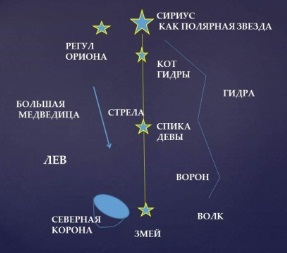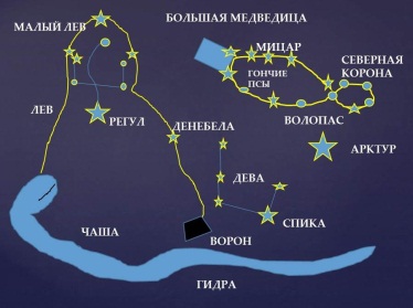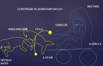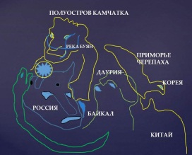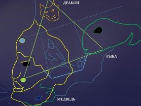Голове Даурии соответствует созвездие Девы, змею – Гидра, черепахе – звёзды трёх созвездий: хвост Большой Медведицы, Гончих Псов и Северной Короны. А льву, понятно, соответствуют соединения звёзд Малого Льва и большого. Озеро Байкал попадает в чёрную дыру созвездия Ворон. А созвездие Тельца в форме морды быка должно быть видно астронавтам через созвездие Льва, которое ближе всех к Солнцу.