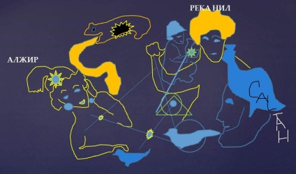Царь Салтан, действительно, заглядывает из темноты (озеленённой части Африки) на свет пустыни Сахара, где бушует огонь песков и выбиты линии, звёзды, птицы, медведь, змей и «три девицы», которые прядут из нитей космоса геометрические фигуры. Если медведь с чёрной дырой у брюха – это Малая Медведица, а змея рядом – это созвездие Дракона, которое её огибает, то можно увидеть, в какой части космоса находятся девицы и Салтан: первая девица соткана из звёзд созвездий Северная Корона, Геркулес и Лира; вторая – из Кассиопеи; Салтан – созвездие Пегас, а третья девица, которая должна родить богатыря – над треугольным крылом Лебедя – в созвездии Ящерицы, в светящемся, огненном яйце рельефа Африки. И мы попали в то же космическое место пространства, что и в сказке «Руслан и Людмила». Наблюдается дублирование сакральной информации на материках. Она очень надёжно спрятана: камни и рельеф не горят, а на случай, если их разрушат взрывами человечки, есть дубликаты.