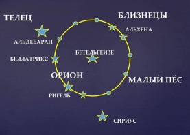 Здесь и Баба-Яга в ступе, и бочка с царевной, пытающейся разбить её стены (или нажимающей кнопки пульта управления), и царевич, выдавивший крышку, в шлеме космонавта. А теперь попробуем узнать место, где это происходит. Подсказка – ступа и морда медведя в середине композиции. Это снова созвездие Эридан, через которое просвечивается созвездие Большой Медведицы. Над бочкой Бабы-Яги (созвездие Эридан) находится тор (круг) Ариев с Аркаимом. Он соответствует небесному кругу, сложенному из звёзд Ригель Ориона, Альдебаран Тельца и звёзд на стопах Близнецов, с центром на звезде Бетельгейзе:
