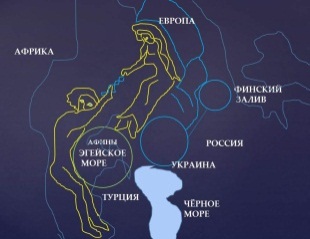 Лжи здесь, похоже, нет. Эту фразу А.С. Пушкин написал, чтобы не вызывать критику непонимающих людей. То, что на небесах существуют боги, мы уже поняли: они творят миры в бездне космоса Тартаре и их соединяют, и ими управляют. Есть ли у Эгейского моря следы этой любовной истории, посмотрим. На рельефе у Эгейского моря есть изображение девушки в колеснице, которая поднимает голого парня из морской воды между Африкой и Турцией (его очертания проступают на рельефе морского дна):