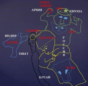 Здесь уже невозможно не указать рисунки, соответствующим созвездиям: пёс (созвездие Большого Пса) с вращающейся звездой (Сириусом), чаша Ориона, которую пёс держит лапой над собой, новая морда кота (скорее, это созвездие Малого Пса). На рельефе Индии выбит голубь с распахнутыми крыльями. Вот и переходим от рельефа Земли в космическое пространство, в котором рулит Баба-Яга в ступе – космическом корабле с мордой волка на его плоскости. На этом же месте рельефа есть голова льва (созвездие Льва), змей у озера Байкал, рядом с ним – голова викинга, и знак W созвездия Кассиопеи, но в теле змеи: