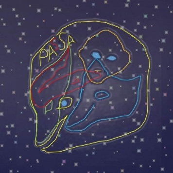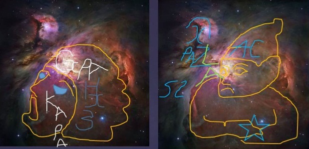 В звёздной пыли, как на рельефе Земли, проглядывают буквы и изображения. Текст виден такой: «Орион (на женском силуэте). Дыра (на кубической голове). Рука зла». В крупной голове написано «Ара, Ариана (страна Ариев)». Огромная чаша находится в центре вихря. В книгах Елены Рерих Орион назван Чашей неспроста. В чаше виден мужской профиль, на голове человека, подписанного, как АС, находится остроконечная шапка, какие видели на рельефе Марса и Земли: