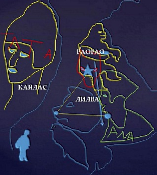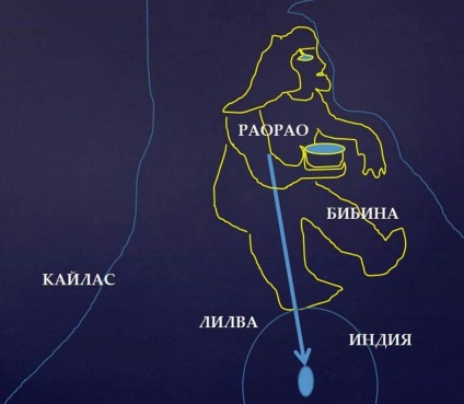 Видим человека, держащего в руке чашу Ориона, рядом пролегает стрела от Сириуса в созвездии Большого Пса к созвездию Голубь, который лежит на спине змеи, уткнувшейся в маленького человечка. Соединяя два изображения, видим голову Тати (отца) на рельефе Кайласа с надписью Ка (человеческий дух), треугольник их трёх звёзд на голове медведя: