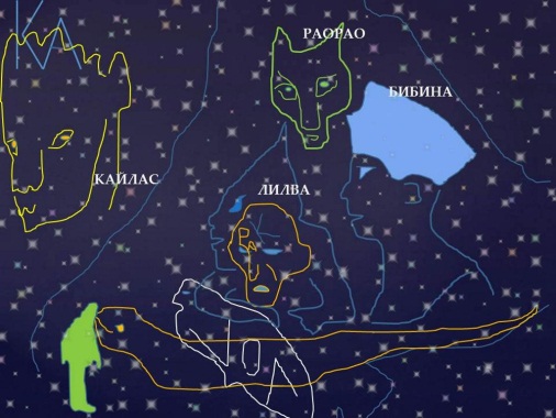 Видим полное совпадение ореола светящегося человека в созвездии Большой Медведицы рисунку человека на рельефе. Посмотрите в Интернете фотографии созвездий, сделанных с помощью телескопа Хаббл и спутника Кассини, и убедитесь: Вселенная тоже разрисована светящейся материей и несёт информацию о тех, кто там живёт. А там тоже живут люди и животные, подобные земным.