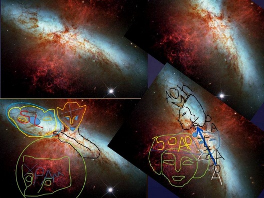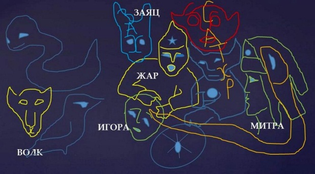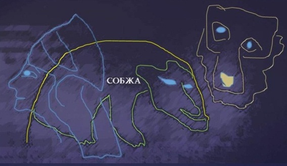 Из космической пыли, света и тени сотканы изображения головы медведя, человека, кота. Подписано на созвездии: «Зоар (сияние). Зара (свет) Коти (кота). Амон». Сразу вспоминается кот, ходящий по цепи кругом А.С. Пушкина. Кот в созвездии ходит вместе с ним по кругу галактики, как на цепи.