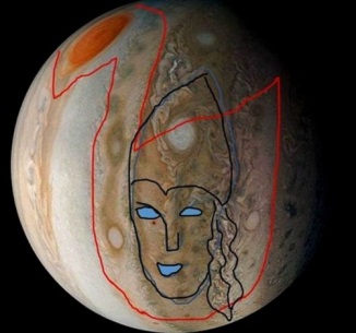 На его газовой оболочке виден гусь и много человеческих лиц. В древнем Египте Юпитер называли «Красный Гусь», гусь на нём и нарисован. В гусе есть изображение человека с кругом и ромбом на голове. И даже есть надпись: «Бог Бон». Глазом гуся является оранжевое пятно Юпитера. Изображение гуся соответствует интерпретации мифа о творении, автором которого является Тот (первый фараон Египта): рождение Ра произошло из Золотого яйца, снесённого гусём (Тот, Википедия, https://ru.wikipedia.org/wiki). Значит, наше Солнце рождено из тела Юпитера. Подтверждением служит портрет гуся, который выбит на рельефе самой южной оконечности Африки в районе территории Зимбабве, у города Мамре: