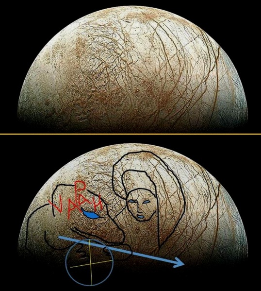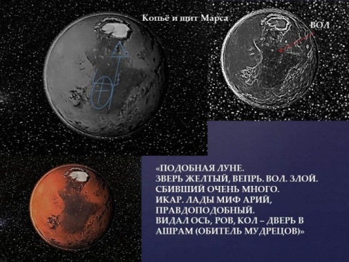 В самом центре снимка видна голова бородатого мужчины и девушка с высокой причёской, в платье с рукавом – фонариком, в котором нарисован круг с крестом, являющимся астрологическим символом Земли. Наклонив голову, она смотрит на бородатого мужчину в чисто русской шапке царских стрельцов. С другой стороны распустила крыло сова, являющаяся символом Тартарии, а слово «Тартар» переводится, как «бездна», «космос». На рукаве её платья, рядом с крестом, нарисовано лицо мужчины. В руках её, сложенных на животе, лежит стрела, начало которой идёт от совы, символа Большой Медведицы, и загибается к кругу Земли, ещё раз подтверждая информацию, снятую с мегалитов и рельефа Земли, о транспортировке астероида – будущей Земли от этого созвездия. Как рельеф Земли, так и рельеф Марса исписан буквами и цифрами. Мне удалось прочитать такую информацию: «Поворачивал сивый, серый господин, храм разбил. Льва убивал. Княжество – камень. Арий (арийский) рай рад жарить. Разреженная атмосфера сияла. Сад голый, собаки (Сириуса) лишил. Стонет бог огня. Шила (камень Шивы) в Раор (Индия), человека ось. Жар. 32 зияли. Возопил сосуд света белой. Мир рептилий повелителя. Колос спеющий жуй, человек. Зри секретные очи, аса гир (копьё, механизм)». Свет «белой» девушки уже показан на поверхности Марса. Копьё и щит со злым волом найден на других снимках планеты: