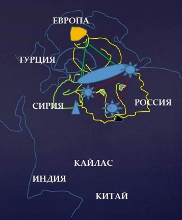 Сравниваем расположение созвездий на глобусе и получаем полное совпадение с рисунком на теле Земли в районе Гималаев и Тибета Индии. Современный глобус кладём горизонтально, чтобы Сириус стал полярной звездой, тогда район Кайласа соответствует созвездию Тельца (злой вол), профиль человека соответствует созвездию Живописец (подписан как Ван), Голубь и Пёс находятся на соответствующих созвездиям местах. Головы между ними соответствуют созвездиям Медведицы и Рака, просвечивающимся в прозрачном космосе, напротив Голубя. Далее, на противоположной стороне глобуса лежит змей – созвездие Дракона. А там находится Малая Медведица – родина современного человека, как уже выяснено в предыдущих книгах. Для этого и нарисован маленький человечек у морды змеи-дракона. Сфера учебного глобуса не передаёт глубину реального космоса, а на рельефе Земли изображена точная объёмная копия звёздного пространства.