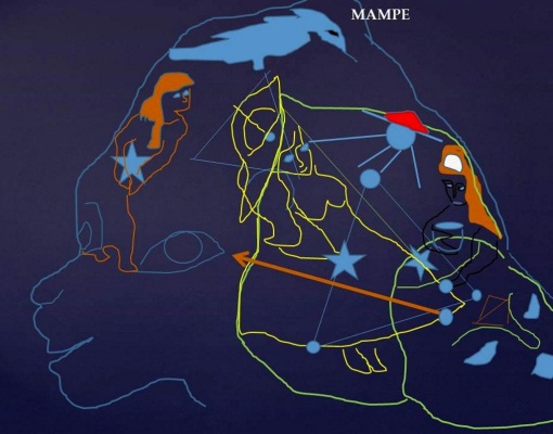 В огромной морде медведя (созвездия Медведицы) видны рельефные птица, девушки. Самая большая женская голова в короне находится на загривке медведя. Кружочки обозначают звёзды, линии и стрелы – их движение. Самая светлая девушка находится в центре картины, её можно назвать «белой», как написано на рельефе Марса. В этом же районе Африки находятся изображения мужчин – воинов, в остроконечных шапках: