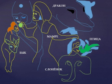 Из огненного духа созвездия Тельца соединением с материей создан человек Хабиба, чьё имя переводится, как «любимец видимых миров». Выше него нарисована огромная морда дракона. Если ставить звёздный глобус Сириусом наверху, то птица на плече Хабибы соответствует созвездию Голубь, морда слона с ушами по ореолу совпадает с очертаниями созвездия Эридан, а голова Хабибы попадает в созвездие Орион. За спиной богинь с Сириуса просвечивается морда Гидры, расположенная на противоположной стороне глобуса. Не забывайте, что космос прозрачен.