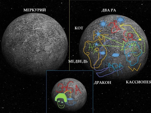 Сразу понятно, кто обитает в этом месте Вселенной. Разум воплощён в этих существах. Как на рельефе Земли, в пузыре есть надписи. Применяя тот же алфавит, что и для мегалитов, и рельефа Земли, можно прочитать: «Раса 5. Зри сирии (серые) рили (рыла). Дити (дети) див (дивные) Тари (Тары). Трон Мары». Тара, как известно, является богиней животных и птиц, а Мара – богиня смерти. Открытие того, что изображения на космических объектах соответствуют заселённой там форме жизни, принадлежит академику О.П. Большаковой (сайт «Научная космоэнергетика», Большакова О.П., 2008 год, http://www.cosmopetrov.ru). Так появились названия созвездия Льва, Медведиц, Рыб, Ибиса, Шакала, Тельца и других, потому что часть созвездий, видимых с нашей Земли, имеют звериные очертания и соответствующие надписи в звёздной пыли. «Как на небе, так и на Земле» – верное выражение эзотерических книг. Это и есть единое информационное поле, написанное буквами русского и латинского алфавита, включая египетские символы. Доказательством служит фотография NASA созвездия Большой Медведицы (этот и все снимки планет и созвездий взяты из источника NASA в свободном доступе, https://zagge.ru/nasa-volshebnye-snimki-kosmosa/) и её рельефная копия у Сиши Корейского полуострова: