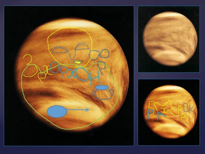 Венера, хоть вся закрыта густыми облаками, всё равно имеет надписи в атмосфере: