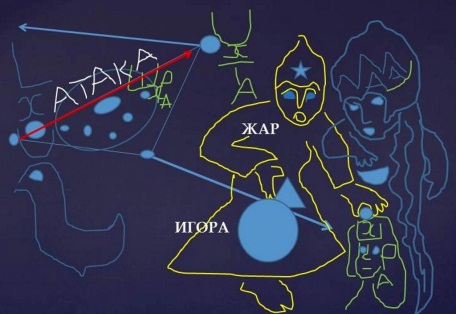 В нижней части крупно видна морда медведя. В облаках прочитан такой текст: «Свет гостьи в оси зрячего Джабраила (ангела). Сила Ур (огненной, психической энергии). Ашрам (обитель мудрецов) зри. Ой, беда за певицей, битва чести. Зори с реки, Жар зовёшь. Митры рок (год). Зри Орион – средство спасения». Посмотрим на рельеф Земли в районе реки Жар: