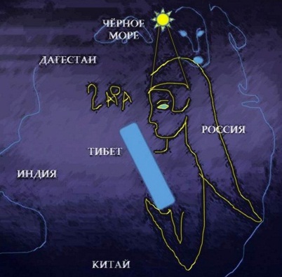 Решето образовано орбитами кружочков – звёзд и планет. В орбите лежит основание треугольника с глазом внутри, как изображено в стодолларовой купюре. Ниже написано: «Мами Ра (мамы солнце)» и «Сварог». Сварог – это небесный огонь, царь семи звёзд, славянский Бог-Творец, муж Лады (Википедия). Самое большая звезда на рисунке находится в морде, находящейся в самом низу Европы, она подписана как «Лив», это звезда созвездия Льва. «Мамы Ра» звучит, как название города Мамре, имеющийся на юге Африки и в США. Найдём на рельефе Земли подсказку, где находится звезда нашей «Мамы». Тор Руси с мордой Льва внутри уже открыт. Женскому силуэту в русском кокошнике тоже есть соответствие на рельефе Украины и России: