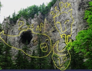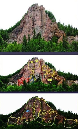 Здесь крупное человеческое лицо, девушка, держащая кристалл, морда льва, спящее женское лицо, человек, держащий стрелу. Всем, думаю, видны надписи на скале, которые я сложила в такой текст: «33 рок (год). Храм Зарай (восход Солнца, фараон – сайт Академик), Доти (дочери) Ара. Ханори («тише!» – с нанайского, сайт Академик), хитрый тсар (царь), сивир (север), 5 Ра (солнц) Рыбы, тати (отец) сит (сидит), творит. Тартари». Если считать от года сотворения Мира, по-славянски, то это было 7527 – 33 = 7494 лет назад. Смысл всего – космический и божественный. Началом созвездия Рыбы является звезда Альфа-Альриша, другая её звезда – Куллат-Нуну. Это жёлтый гигант, свет которого больше солнечного в 300 раз, углеродная звезда (сайт kosmosgid.ru). Созвездие Рыб граничит в созвездиями Овна, Треугольником и Пегасом. Посмотрите на рисунки скалы, вы увидите изображение рыбы, морды рогатого, тигра или льва и треугольника (кристалла):