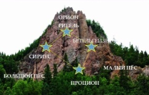 Здесь и упоминание о Сириусе (Шира), лица, морды собак и текст. Написано о чарах Ария, выбита двойная звезда и солнце в треугольнике. На звёздном глобусе, в июле наше Солнце находится в треугольнике между Малым и Большим Псами, а ромб, соединяющий сторонами главные звёзды Ориона и Псов, выбит на скале и присутствует на глобусе: