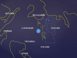 Вокруг круглого отверстия пещеры выбит квадрат, соответствующий квадрату из звёзд Пегаса на небесном глобусе. Как видите, на скале и на звёздном глобусе очень много совпадений, что не может быть случайным. Только на скале изображение плоское, а на глобусе искажается сферой. Виднеется на камне и в космосе загадочная цифра 2, а рядом выбитое слово «Ватра», что означает в переводе с украинского «костёр, огонь» и город в Молдавии (сайт Академик). Откроем спутниковые карты Земли и в районе Европы и России увидим рельефную цифру 2 и слово «Ватра»: