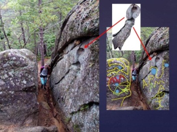 Теперь найду другую информацию, ведь камни – «кладезь памяти» предков. И соответствие изображений на скале звёздному небу я ещё тоже не искала. Идти к ней полтора часа по лесу от бывшего пионерлагеря «Дружба» в Дальнегорском районе. В одну и попыток похода к скале, на нас кинулся тигр. Кусты растут так тесно, что сначала мы услышали рык на весь лес и хруст веток. Потом я увидела недалеко тигра, он отбежал в лес. Пришлось вернуться назад. Так что, осторожнее. Компания должна быть большая. В этот раз нас было пять человек, но на тропе лежали в разных местах два щитомордника и даже не хотели уползать. Чудом мы на них не наступили.