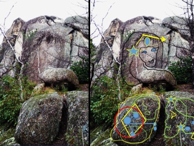 Следующие каменные (мегалитические) изваяния тоже кажутся хаотичной свалкой. Но приглядитесь: здесь выбиты сложные звёздные системы (круги с лучами я обозначила звёздами), голова человека с большим глазом (подписан как Саиф), силуэт девушки, морда медведя на камне в нижней части фотографии: