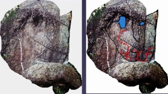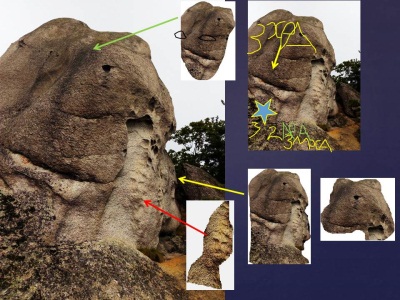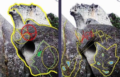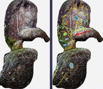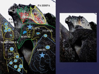 Великана видим сзади, его плечи и профиль. В нём же выбита губастая морда и голова медведя. На скуле великана выбита голова человека, над которым выбито слово «чира», то есть, птица. Разгадываю ребус: вверху есть изображение круга с лучами (звезда), крупная надпись «Зара Ра» (свет солнца) со стрелкой к пышной губе, на шее великана выбита звезда и надписи «32 Ара. Змиа (змея)», «Ара раса, Зохар хара». Зохар с еврейского переводится как «сияние», «хара» означает «великий», «созидающая сила» (Википедия). Получается, что на мегалите изображён Великий Сияющий, к тому же, над его глазом и на скуле его лица изображены сияющие звезды. Птица изображена от глаза великана до низа мегалита: