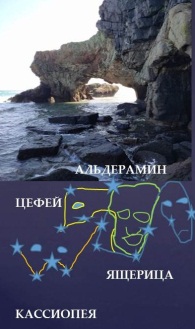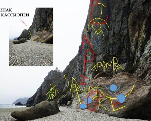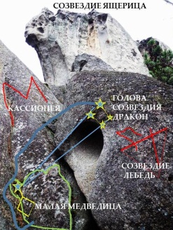 Выбитые буквы сложились в текст: «Ра Кассио (знак Кассиопеи на скале слева присутствует) соосно Хава (мать всего живого, с еврейского) сара (знатная) Ка (человеческий дух). Храм смерти Мара (лицо из чёрной скалы). Зив (зев) ути (утки). Храм-дыра Мара. Вараний (ящерицы или дракона) храм Захарии». Уже выяснили, что созвездие Кассиопеи абрисом похоже на утку или гуся. Захарий – это имя с иврита переводится, как «помнящий Яхве (сущий, живой – со старославянского, Википедия)». Находится ли Кассиопея соосно с созвездием – храмом Ящерицы, посмотрим на звёздной карте: