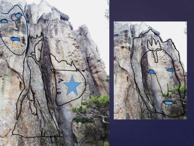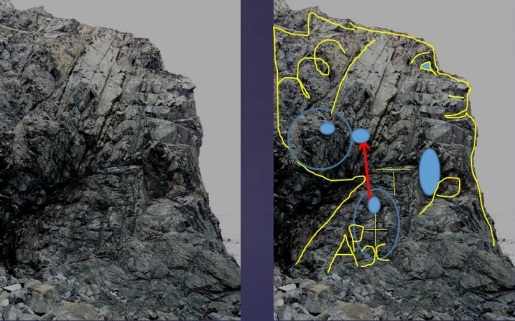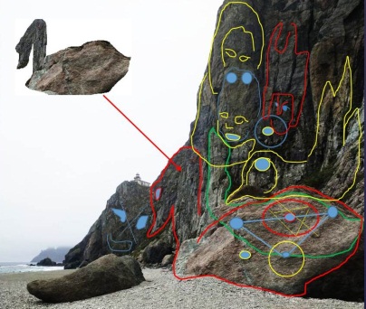 Арке под скалой соответствует космическое пространство под шеей уточки, являющейся абрисом из звёзд Цефея. Вот она, ещё одна небесная уточка. Вараний храм находится в квадрате из звёзд созвездия Ящерицы, там живёт помнящий Яхве Захарий. Звёзды Кассиопеи на карте и скале лежат на одной линии (соосно) с квадратом из звёзд Ящерицы. Как видите, многое совпадает. Кроме этого, могу вам показать каменный портрет Захария: