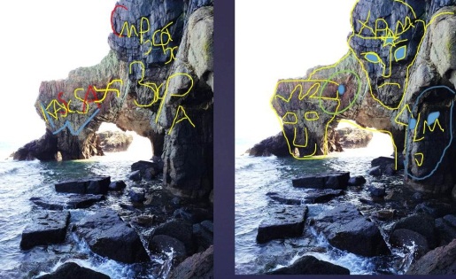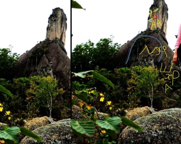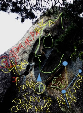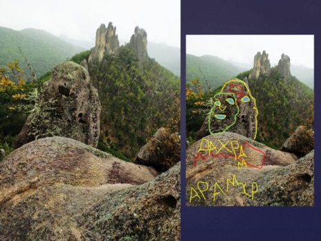 Надписи на скале гласят: «Ари тор». В то же время, я вижу на скале изображение морды собаки с высунутым языком и с кружком на носу: