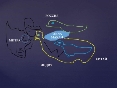 Голова человека под ним и соседние профили слева и справа соответствуют рельефу с лицами в центре Азии, если смотреть с побережья Дальнего Востока. Это Митра, Сара (знатная) и ребёнок в ползунках возле озера Байкал. Это всё я доказала уже в другой своей книге: