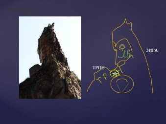 С третьей стороны скала выглядит как человек в кепке с рядом стоящей невестой в фате, которые обвиты змеем: