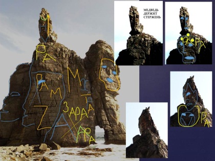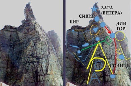В совокупности, по обведённым буквам на скале читатель увидит слова: «Храм Захара. Ра. Митра. Зара. Трон Тота». Ещё я рассмотрела звёздочки и текст: «Шира дом (Сириус, Большой Пёс). Полар (Полярная звезда). Полиш (полюс). Кот. Карма там. Шар Ра Диа (Дия) тиара (головной убор) – три Ра: Шира (Сириус), Зара (Венера), Зира (звезда Альзирр, Кси Близнецов, сайт astrokot.kiev.ua/slovar) рахат (адепт, сайт Академик). Тьма номо (закон). Ра дира (дыра). Атри (древнеиндийский мудрец, сайт Академик) ритин (красная крепость, Википедия) Ра. Ара тор. Грот. Нора Тора (бог грома и молнии, как Перун, Википедия)». На схеме это выглядит так: